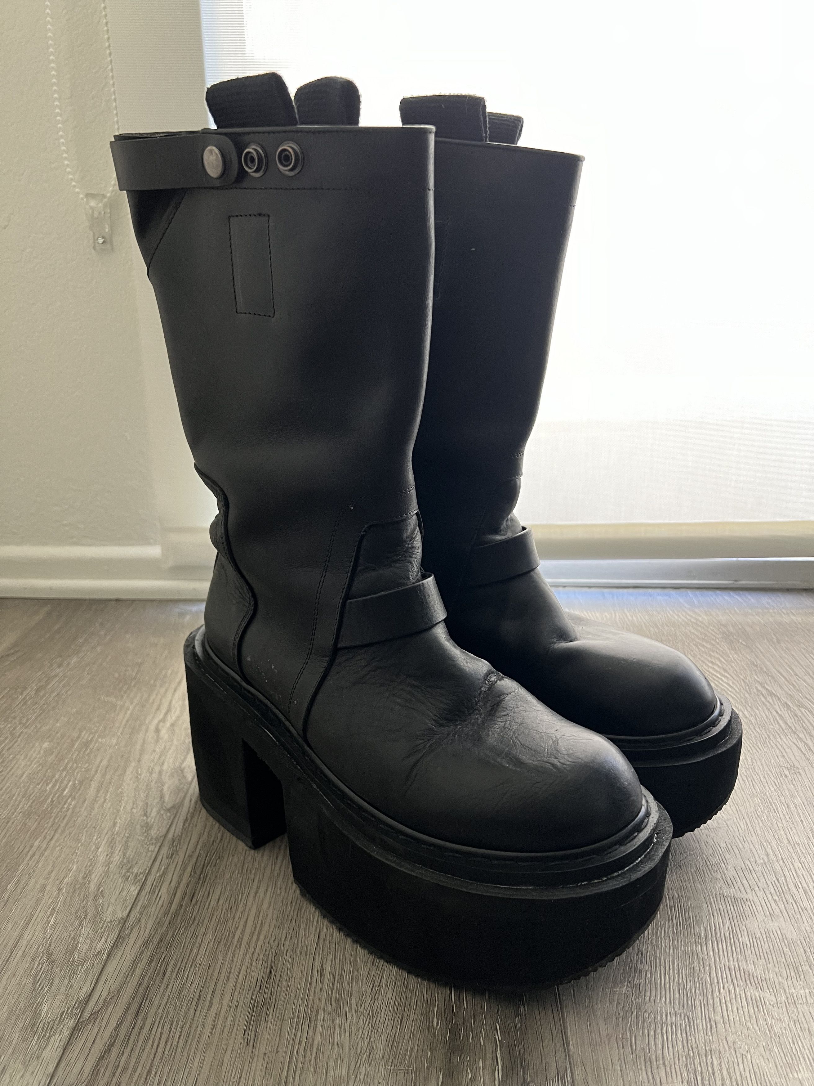 Rick Owens Anthem Platform Custom Leather Biker Boot Eu43 in Black, Men's (Size 10)Rick Owens Anthem Platform Custom Leather Biker Boot Runway Piece Calf Height Rubber Foam Custom Sole Professionally Added - Will Not Come Out!!!! Platform Height - Heel Height - Round Toe Upper: 100% Calf Leather Lining: 100% Calf Leather Made In Italy Size Eu43/us10/uk9 (Fits Tts) Condition - Worn 5X For Night EventsRick Owens