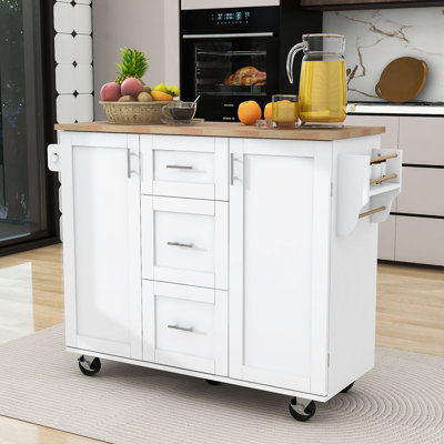 Rolling kitchen cart with drop-leaf kitchen island on wheels with 3 drawers, 2 cabinets, natural wood topsRolling kitchen cart with drop-leaf kitchen island on wheels with 3 drawers, 2 cabinets, natural wood tops Lark Manor Base Color: WhiteLark Manor