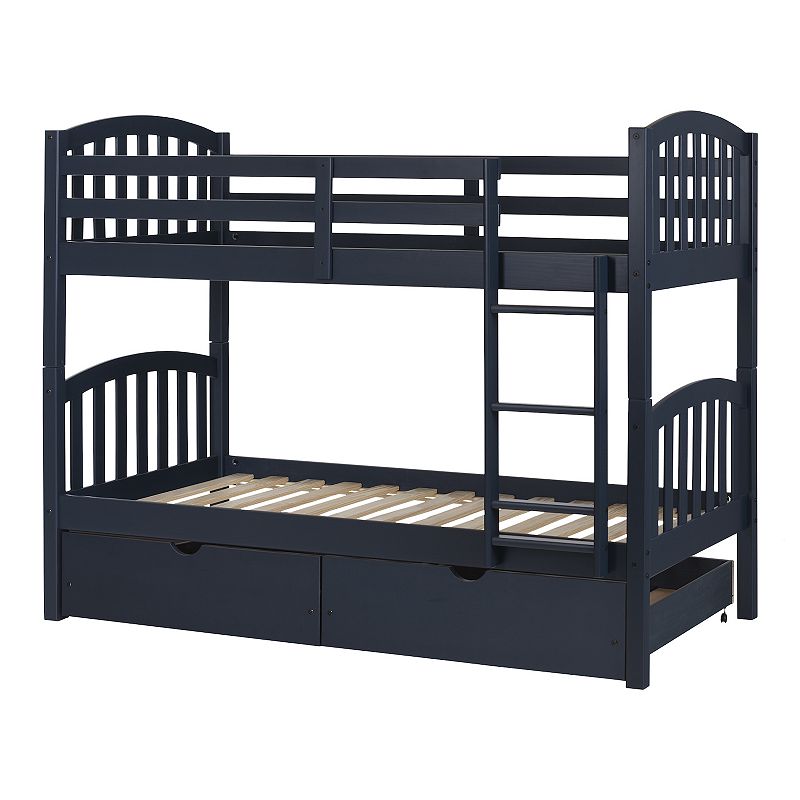 South Shore Ulysses Twin Bunk Bed & Rolling Drawers Set, Navy BlueGive your space an instant refresh with this South Shore Ulysses Twin Bunk Bed and Rolling Drawers Set. Two drawers on unidirectional casters are easy for kids of all ages to reach Convert it into a single bed by removing the top bunk Designer-inspired details at either end 43.5"H x 66"W x 79.5"D Weight: 40.25 lbs. LamSouth Shore