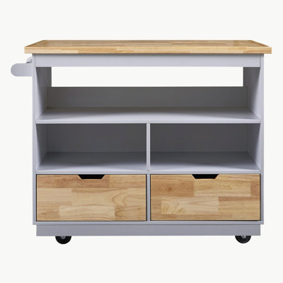 Rolling Kitchen Island with StorageThe front of the storage unit is designed with functionality in mind, providing three layers of storage space. The two large drawers are ideal for storing utensils, kitchen towels, or other larger items, while the two open compartment storages at the back offer easy access to frequently used items such as cutting boardRed Barrel Studio