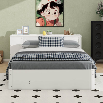Full-Sized Platform Bed Featuring A Rolling ShelfThis Full bed frame made of high-quality pine wood, the frame of this full bed is not easy to be affected by humidity change and lead to crack. the strong legs and wide boards can not only improve the weight capacity but also increase its stability. This full bed comes with a trundle, easy to pull in and out, multi-funLark Manor