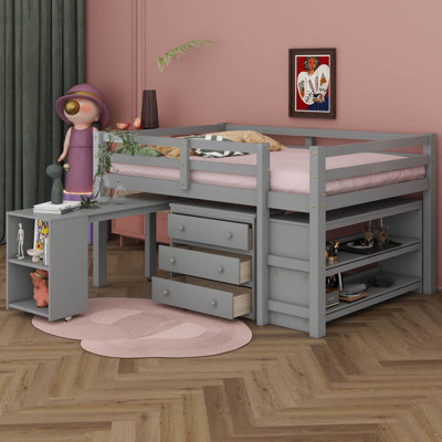 Justien Low Study Full Loft Bed With Cabinet ,Shelves And Rolling Portable DeskCrafted with attention to detail, this bed's solid pine wood construction and robust frame offer superior stability and longevity. Enjoy peace of mind with a design that prioritizes both durability and style in your home furnishings. Safety is paramount with this bed's full-length guardrail and sturdy handrail, ensurinHarriet Bee