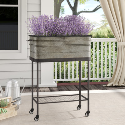 Aaleena Metal Planter Tub on Stand with Rolling WheelsThis galvanized silver and black metal planter tub with rolling wheels and a stand is a great way to display and grow plants in style. This metal planter tub is designed to look like an old-fashioned wash tub with a galvanized silver and black finish that gives it a rustic and antique appeal. The tub can hold a large aGracie Oaks