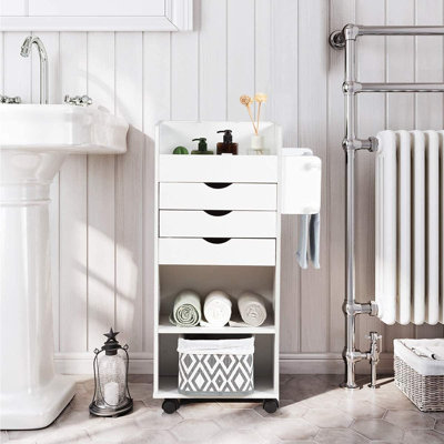 Storage Rack Rolling Cart with Wheels Strong Load-bearing Mobile Rack Trolley BookshelfOrganize your kitchen, living room, bathroom, or office with this four-tier rolling cart. From vegetables to towels, this cart accommodates various items efficiently.Maneuver with ease using the 360-degree removable wheels and sturdy construction. Pull out this cart effortlessly from tight spaces for convenient accessEbern Designs