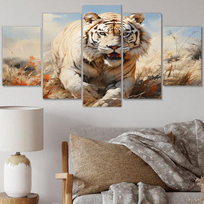 White Tiger On A Vast Expanse Of Rolling Grassland I - Animals Tiger Metal Wall Decor SetBring contemporary abstraction to your home with this Beige metal wall art set. This "White Tiger On A Vast Expanse Of Rolling Grassland I" metal artwork, making it the focal point of any room or office. Elevate your space with our exquisite metal wall decor printed on a sleek aluminium sheet. The marriage of industriaDakota Fields