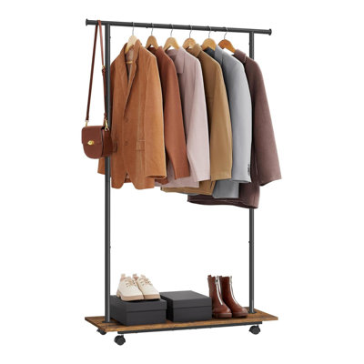 38.8'' Rolling Clothing RackThe top rod, measuring 38.8 inches in length, provides ample space on this clothing rack for hanging a variety of items. Meanwhile, the sturdy bottom shelf is perfectly suited for neatly storing footwear and boxes.The clothes rack boasts an ink black steel frame paired with a rustic brown shelf, radiating a retro indusRebrilliant