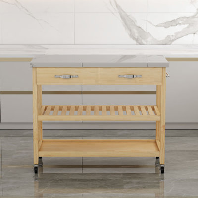 Storage Rolling Kitchen Island with Stainless Steel CountertopThis 3-tier rotatable kitchen island is built in a Classic style with beautiful natural pine wood, a stylish stainless steel top, 4 smooth casters, and ample storage and shelves.4 smooth rolling wheels with 2 lockable brakes makes this microwave cart on wheels super simple to move to whatever location you need it.EnsurEbern Designs