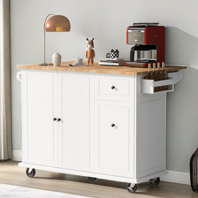 Toleda Rolling Kitchen Island with Drop Leaf Top and 3-tier Pull-Out CabinetA multifunctional kitchen island can make the kitchen more tidy and organized, providing greater convenience for cooking and family life. The solid rubber wood top with drop leaf provides more space to prepare meals or serve as a dining table. Deciduous tables are easy to fold when not in use, optimising the utilizatioRed Barrel Studio