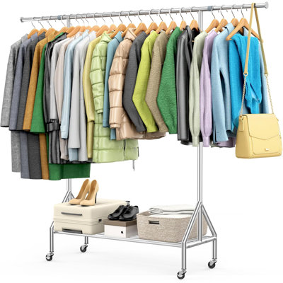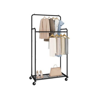 Double Rod Clothes Garment Rack,Clothing Rolling Rack on Wheels for Hanging Clothes,4 HooksGreat for organize and create storage space in your laundry room, bedroom, even for display in a store or market Considerate Details DesignTop hanging rail designed with stoppers on each side to prevent the clothes from falling Durable & SturdyMade of a highly resistant metal with Bronze paint and Chrome finish to enhaEverly Quinn