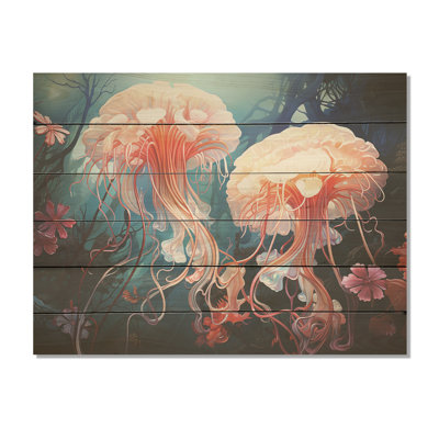 Blue And Pink Jellyfish Dance - Coastal Coral Under Water Wood Wall Art On Natural Pine WoodWood art printed on wood planks is a mesmerizing fusion of nature's intrinsic allure and artistic ingenuity. Each piece starts with a careful selection of wooden planks, chosen for their distinctive grains, knots, and textures, transforming them into canvases of rustic beauty. We employ the highest quality 6-color CanoBeachcrest Home