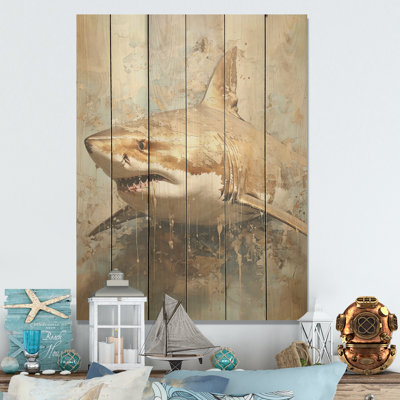 Minimalism Shark Painting In Golden Beige - Shark Wood Art On Natural Pine WoodWood art printed on wood planks is a mesmerizing fusion of nature's intrinsic allure and artistic ingenuity. Each piece starts with a careful selection of wooden planks, chosen for their distinctive grains, knots, and textures, transforming them into canvases of rustic beauty. We employ the highest quality 6-color CanoBeachcrest Home