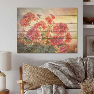 Geraniums Sunset Blooming I - Geraniums Wood Wall Art On Natural Pine WoodWood art printed on wood planks is a mesmerizing fusion of nature's intrinsic allure and artistic ingenuity. Each piece starts with a careful selection of wooden planks, chosen for their distinctive grains, knots, and textures, transforming them into canvases of rustic beauty. We employ the highest quality 6-color CanoLark Manor