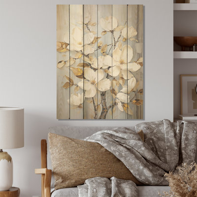 Minimalism White Magnolias Blossom I - Magnolias Wood Wall Art On Natural Pine WoodWood art printed on wood planks is a mesmerizing fusion of nature's intrinsic allure and artistic ingenuity. Each piece starts with a careful selection of wooden planks, chosen for their distinctive grains, knots, and textures, transforming them into canvases of rustic beauty. We employ the highest quality 6-color CanoLark Manor