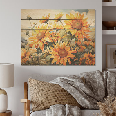 Sunflowers Minimalism Dream I - Sunflowers Wood Art On Natural Pine WoodWood art printed on wood planks is a mesmerizing fusion of nature's intrinsic allure and artistic ingenuity. Each piece starts with a careful selection of wooden planks, chosen for their distinctive grains, knots, and textures, transforming them into canvases of rustic beauty. We employ the highest quality 6-color CanoAugust Grove