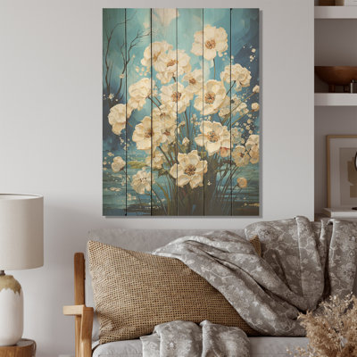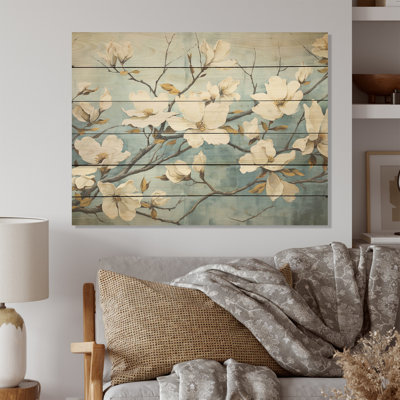 White Blue Dogwood Peacefulness - Dogwood Wood Wall Art On Natural Pine WoodWood art printed on wood planks is a mesmerizing fusion of nature's intrinsic allure and artistic ingenuity. Each piece starts with a careful selection of wooden planks, chosen for their distinctive grains, knots, and textures, transforming them into canvases of rustic beauty. We employ the highest quality 6-color CanoLark Manor