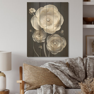 White And Black Floral Delights In Ranunculus - Ranunculus Wood Art On Natural Pine WoodWood art printed on wood planks is a mesmerizing fusion of nature's intrinsic allure and artistic ingenuity. Each piece starts with a careful selection of wooden planks, chosen for their distinctive grains, knots, and textures, transforming them into canvases of rustic beauty. We employ the highest quality 6-color CanoLark Manor