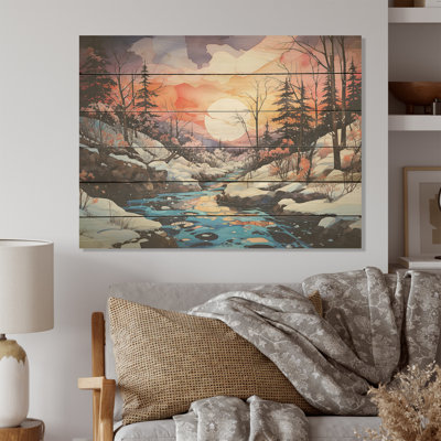 Winter Snow Sunrise By The River - Snow Wood Art On Natural Pine WoodWood art printed on wood planks is a mesmerizing fusion of nature's intrinsic allure and artistic ingenuity. Each piece starts with a careful selection of wooden planks, chosen for their distinctive grains, knots, and textures, transforming them into canvases of rustic beauty. We employ the highest quality 6-color CanoMillwood Pines
