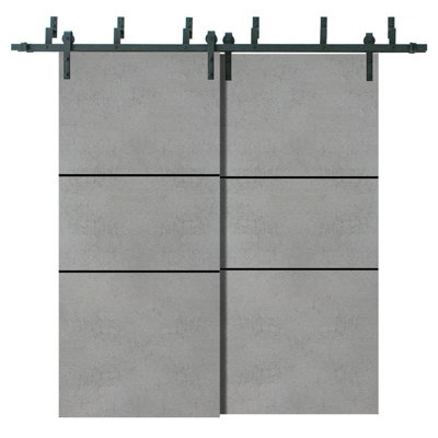 Solid Manufactured Wood Paneled Wood Finish Barn DoorSET INCLUDES: 2 Door Slabs 2 steel rails 6.6FT each Hangers with wheels Door Stops Floor Guide Brackets Anti-Jump pins Installation Manual Screws for hardware Doors are not pre-drilled! It is not recommended to paint.Thickness of the door slab is 40 mm or 1 9/16".Introducing the Modern Barn Bypass Doors from the PlanumSARTODOORS