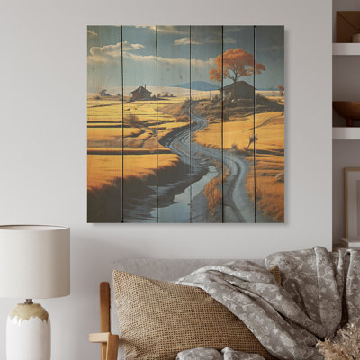 Countryside Grey And Yellow Road - Countryside Wood Wall Art On Natural Pine WoodWood art printed on wood planks is a mesmerizing fusion of nature's intrinsic allure and artistic ingenuity. Each piece starts with a careful selection of wooden planks, chosen for their distinctive grains, knots, and textures, transforming them into canvases of rustic beauty. We employ the highest quality 6-color CanoAugust Grove