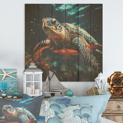 Realistic Portrayal Of A Turtle I - Turtle Wood Panel Wall Art On Natural Pine WoodWood art printed on wood planks is a mesmerizing fusion of nature's intrinsic allure and artistic ingenuity. Each piece starts with a careful selection of wooden planks, chosen for their distinctive grains, knots, and textures, transforming them into canvases of rustic beauty. We employ the highest quality 6-color CanoBay Isle Home