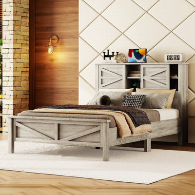 Farmhouse Platform Bed With Double Sliding Barn Door, Full Size Rustic Wood Bed Withcharging Station, Wood Slats Support+BrownCrafted from high-quality wood, this bed showcases craftsmanship and durability. Experience the perfect blend of functionality and style, allowing you to enjoy the comfort and beauty of this impeccably crafted wooden bed. Gracie Oaks Color: Antique Gray, Size: FullGracie Oaks