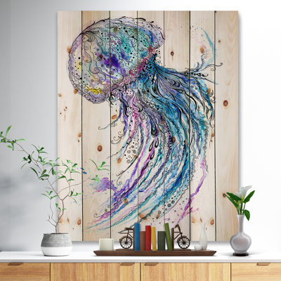 Jelly Fish Watercolor - Traditional Wood Wall Art Decor - Natural Pine WoodAlas, a modern take on wood wall art. Once typically a wall art piece found only in rustic or farmhouse style decor settings, this Animals wood wall art will easily fit into even the most contemporary of designs. Using the highest quality 6 color canon UV ink, this Traditional wood wall art incorporates several aspectsHighland Dunes