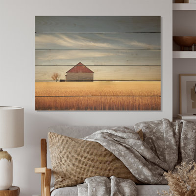Red Barn Minimalism Country Charm I - Barn Wood Wall Art On Natural Pine WoodWood art printed on wood planks is a mesmerizing fusion of nature's intrinsic allure and artistic ingenuity. Each piece starts with a careful selection of wooden planks, chosen for their distinctive grains, knots, and textures, transforming them into canvases of rustic beauty. We employ the highest quality 6-color CanoLark Manor