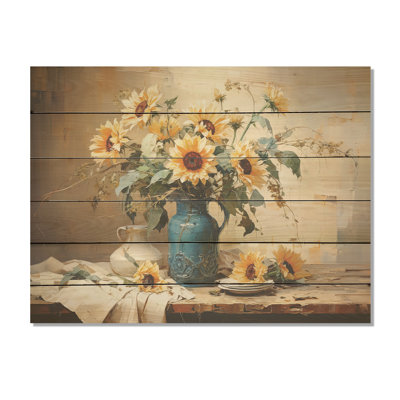 Blue Sunflowers Farmhouse Still Life I - Sunflowers Wood Art On Natural Pine WoodWood art printed on wood planks is a mesmerizing fusion of nature's intrinsic allure and artistic ingenuity. Each piece starts with a careful selection of wooden planks, chosen for their distinctive grains, knots, and textures, transforming them into canvases of rustic beauty. We employ the highest quality 6-color CanoLark Manor