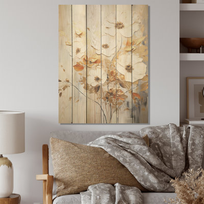 Beige And Blue Seasonal Flowers Collage - Seasonal Flowers Wood Art On Natural Pine WoodWood art printed on wood planks is a mesmerizing fusion of nature's intrinsic allure and artistic ingenuity. Each piece starts with a careful selection of wooden planks, chosen for their distinctive grains, knots, and textures, transforming them into canvases of rustic beauty. We employ the highest quality 6-color CanoLark Manor