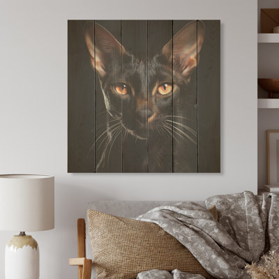 Oriental Elegance Black Cat Portrait I - Cat Wood Wall Art On Natural Pine WoodWood art printed on wood planks is a mesmerizing fusion of nature's intrinsic allure and artistic ingenuity. Each piece starts with a careful selection of wooden planks, chosen for their distinctive grains, knots, and textures, transforming them into canvases of rustic beauty. We employ the highest quality 6-color CanoLark Manor