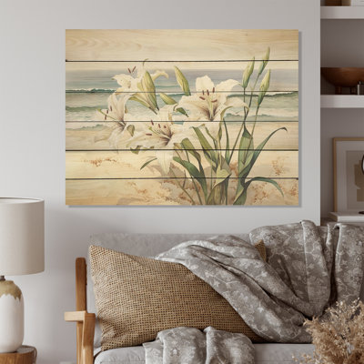 Glory Lilies On The Beach I - Lilies Wood Wall Art On Natural Pine WoodWood art printed on wood planks is a mesmerizing fusion of nature's intrinsic allure and artistic ingenuity. Each piece starts with a careful selection of wooden planks, chosen for their distinctive grains, knots, and textures, transforming them into canvases of rustic beauty. We employ the highest quality 6-color CanoHighland Dunes
