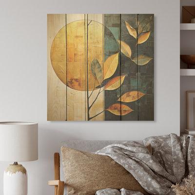 Golden Geometry Leaves Foliage I - Leaves Wood Wall Art On Natural Pine WoodWood art printed on wood planks is a mesmerizing fusion of nature's intrinsic allure and artistic ingenuity. Each piece starts with a careful selection of wooden planks, chosen for their distinctive grains, knots, and textures, transforming them into canvases of rustic beauty. We employ the highest quality 6-color CanoWinston Porter