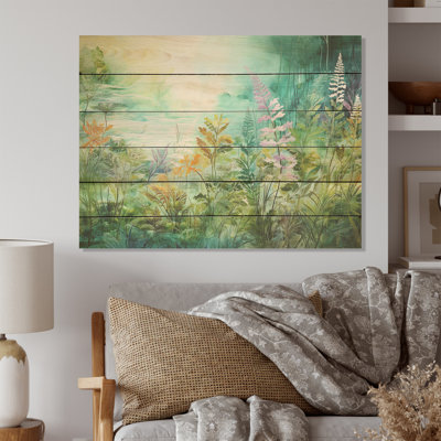 Ferns In The Wild Flowers Field I - Flower Field Wood Wall Art On Natural Pine WoodWood art printed on wood planks is a mesmerizing fusion of nature's intrinsic allure and artistic ingenuity. Each piece starts with a careful selection of wooden planks, chosen for their distinctive grains, knots, and textures, transforming them into canvases of rustic beauty. We employ the highest quality 6-color CanoLark Manor