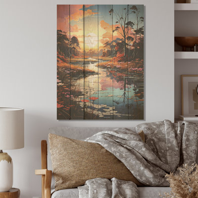 Rivers Sunrise Enchantment - Lake River Wood Wall Art On Natural Pine WoodWood art printed on wood planks is a mesmerizing fusion of nature's intrinsic allure and artistic ingenuity. Each piece starts with a careful selection of wooden planks, chosen for their distinctive grains, knots, and textures, transforming them into canvases of rustic beauty. We employ the highest quality 6-color CanoOphelia & Co.