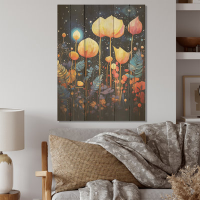 Galaxy Night Botanical Plants I - Flowers Wood Art On Natural Pine WoodWood art printed on wood planks is a mesmerizing fusion of nature's intrinsic allure and artistic ingenuity. Each piece starts with a careful selection of wooden planks, chosen for their distinctive grains, knots, and textures, transforming them into canvases of rustic beauty. We employ the highest quality 6-color CanoOphelia & Co.