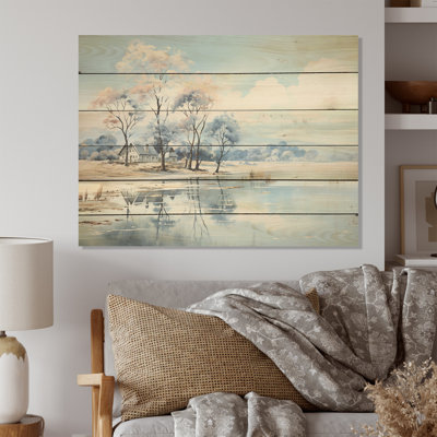 Lakeside Nature Serenity I - Lakes Lakehouse Wood Wall Art On Natural Pine WoodWood art printed on wood planks is a mesmerizing fusion of nature's intrinsic allure and artistic ingenuity. Each piece starts with a careful selection of wooden planks, chosen for their distinctive grains, knots, and textures, transforming them into canvases of rustic beauty. We employ the highest quality 6-color CanoLark Manor