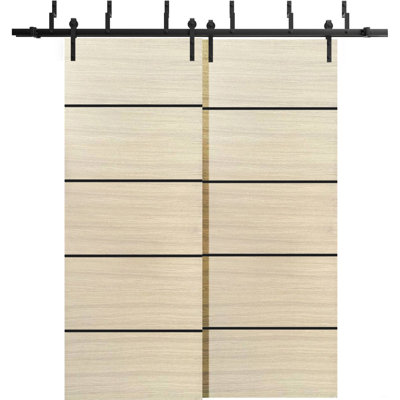 84'' Solid Manufactured Wood Paneled Wood Finish Barn DoorSET INCLUDES: -2 Door Slabs-2 steel rails each-Hangers with wheels-Door Stops-Floor Guide-Brackets-Anti-Jump pins-Installation Manual-Screws for hardware Doors are not pre-drilled! It is not recommended to paint.Thickness of the door slab is 40 mm or 1 9/16". Introducing the "Modern Barn Bypass Doors" from the esteemedSARTODOORS