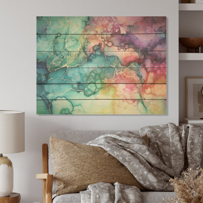 Teal Purple Borealis Liquid Ink Lansdcape - Aurora Borealis Wood Wall Art On Natural Pine WoodWood art printed on wood planks is a mesmerizing fusion of nature's intrinsic allure and artistic ingenuity. Each piece starts with a careful selection of wooden planks, chosen for their distinctive grains, knots, and textures, transforming them into canvases of rustic beauty. We employ the highest quality 6-color CanoIvy Bronx