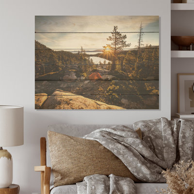 Mountain Hiking Views Tranquility - Mountains Wood Art On Natural Pine WoodWood art printed on wood planks is a mesmerizing fusion of nature's intrinsic allure and artistic ingenuity. Each piece starts with a careful selection of wooden planks, chosen for their distinctive grains, knots, and textures, transforming them into canvases of rustic beauty. We employ the highest quality 6-color CanoMillwood Pines