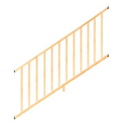 6 ft. Moulded Wood Stair Railing Kit with Square Wood BalustersThis 6-foot-on-center wood stair railing kit for outdoor stairs comes in a ready-to-build kit, complete with balusters. The square, solid wood balusters have straight ends and are installed between the rails. The rails are molded with rounded edges and cut with a 34-degree angle for easy installation. Theyre availableProWood