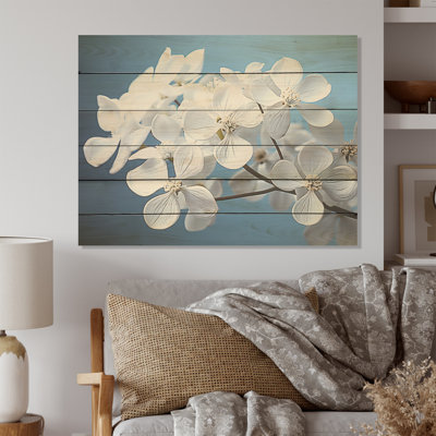 Soft Neutral Tones Portray Hydrangea Blooms - Hydrangea Wood Wall Art On Natural Pine WoodWood art printed on wood planks is a mesmerizing fusion of nature's intrinsic allure and artistic ingenuity. Each piece starts with a careful selection of wooden planks, chosen for their distinctive grains, knots, and textures, transforming them into canvases of rustic beauty. We employ the highest quality 6-color CanoLark Manor