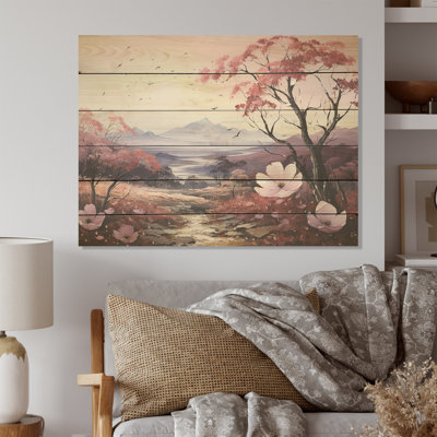 Pink Trees Blooming In Mountain Charm I - Trees Wood Wall Art On Natural Pine WoodWood art printed on wood planks is a mesmerizing fusion of nature's intrinsic allure and artistic ingenuity. Each piece starts with a careful selection of wooden planks, chosen for their distinctive grains, knots, and textures, transforming them into canvases of rustic beauty. We employ the highest quality 6-color CanoLark Manor