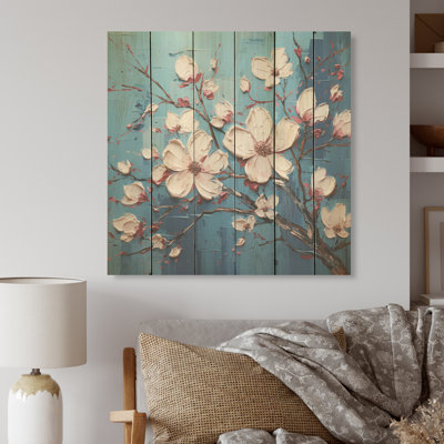 Blooms Expressionist Vitality - Dogwood Wood Wall Art On Natural Pine WoodWood art printed on wood planks is a mesmerizing fusion of nature's intrinsic allure and artistic ingenuity. Each piece starts with a careful selection of wooden planks, chosen for their distinctive grains, knots, and textures, transforming them into canvases of rustic beauty. We employ the highest quality 6-color CanoWinston Porter
