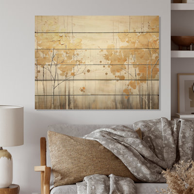 Minimalism White And Gold Forest I - Forest Wood Wall Art On Natural Pine WoodWood art printed on wood planks is a mesmerizing fusion of nature's intrinsic allure and artistic ingenuity. Each piece starts with a careful selection of wooden planks, chosen for their distinctive grains, knots, and textures, transforming them into canvases of rustic beauty. We employ the highest quality 6-color CanoLark Manor
