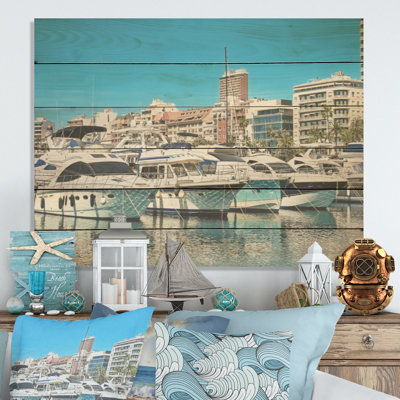 Boats Docked At Port Alicante Spain - Boat Wood Wall Art On Natural Pine WoodWood art printed on wood planks is a mesmerizing fusion of nature's intrinsic allure and artistic ingenuity. Each piece starts with a careful selection of wooden planks, chosen for their distinctive grains, knots, and textures, transforming them into canvases of rustic beauty. We employ the highest quality 6-color CanoEbern Designs