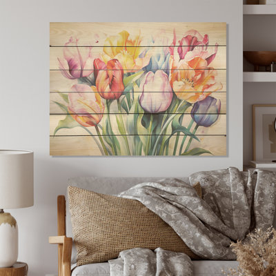 Painted Multicolor Tulips Collage - Tulips Wood Panel Wall Art On Natural Pine WoodWood art printed on wood planks is a mesmerizing fusion of nature's intrinsic allure and artistic ingenuity. Each piece starts with a careful selection of wooden planks, chosen for their distinctive grains, knots, and textures, transforming them into canvases of rustic beauty. We employ the highest quality 6-color CanoLark Manor