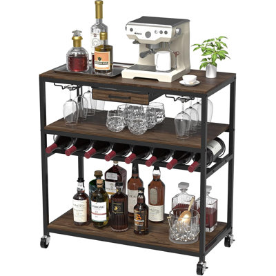 Wine Bar Cabinet With Rolling Wheels, Industrial Coffee Bar With Wine Rack, Glass Holder And Drawer, Wood And Metal Farmhouse Liquor Coffee Bar CupboaThe wine bar cabinet features two wine glasses holders, 1 convenient drawer, 1 wine holder for 8 bottles and 3 open shelves for providing more space to storage your bottles, coffee makers, plates, cups, kitchen utensils and so on. The coffee bar cabinet can be used as a wine bar cabinet, coffee station, or microwave st17 Stories