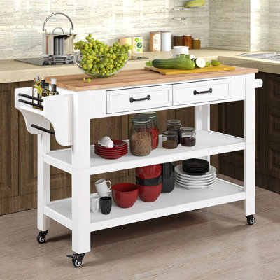 Deahna Rolling Kitchen Island with Solid + Manufactured Wood TopThis vintage kitchen island with a classic look and functional design creates a charming and classic aesthetic, it can be combined with a variety of decorative styles, has a classic look, is an excellent storage solution for your kitchen or other space, made of solid wood oak, rubber wood and high quality MDF to supporAlcott Hill