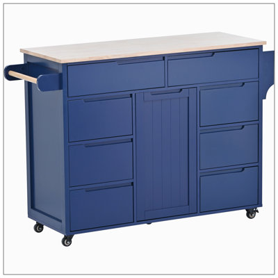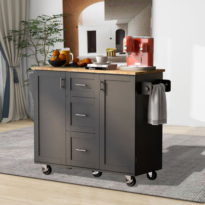 50'' Wide Rolling Kitchen Island with Storage and Solid Wood TopElevate your kitchen with the 50" Wide Rolling Kitchen Island, designed for both style and functionality. Featuring a durable rubber wood top and ample storage space, this kitchen island is perfect for meal prep, organization, and enhancing your culinary workspace. The innovative slide-out shelves, internal storage racLark Manor