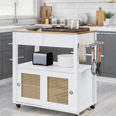 Ayane Rolling Kitchen Island with Solid Wood TopKitchen Island with Storage, Rolling Kitchen Island on Wheels with Solid Wood Countertop, Kitchen Island Cart with Rattan Storage Cabinet, Spice Rack, Towel Rack and Drawers Bay Isle Home Base Color: WhiteBay Isle Home